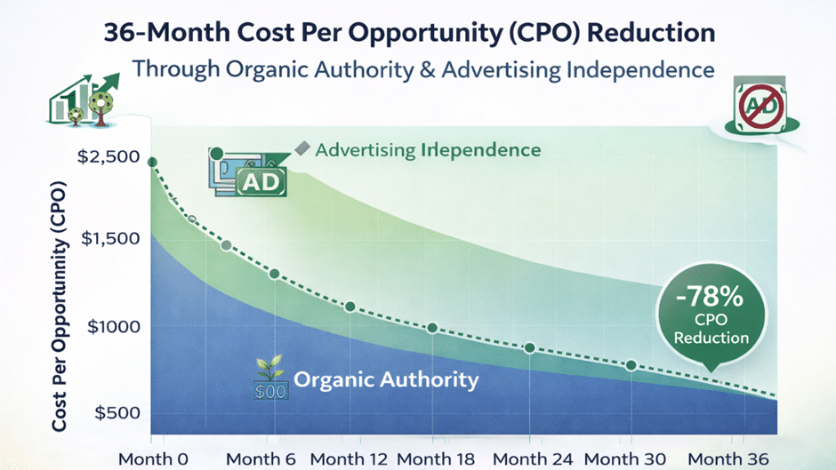 When reporting to the Board, the conversation shifts to Cost Per Opportunity (CPO) and Lifetime Value (LTV). Data shows that leads from deep semantic authority have a 25% higher close rate than paid leads. The Empire performs the “Trust Transfer” before the first human interaction.