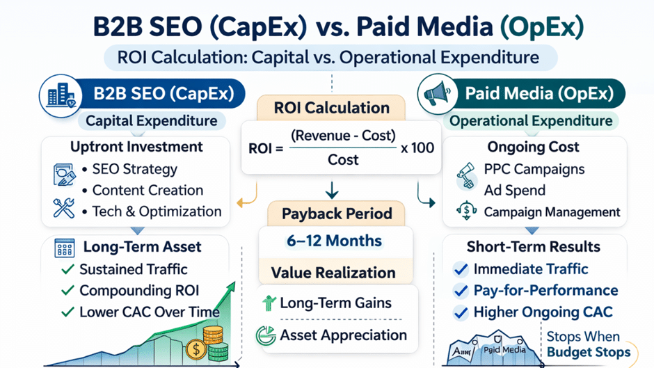 In the traditional accounting view, marketing is treated as a line item under Operating Expenditures (OpEx). For a CFO, this means every dollar spent on customer acquisition is “consumed” within the fiscal period. This is particularly true for Paid Media (SEA). When a B2B firm spends $100,000 on Google Ads, that capital is gone the moment the click occurs. If the lead does not convert immediately, the investment has zero residual value. This creates a dangerous dependency: the business is essentially “renting” its market share.